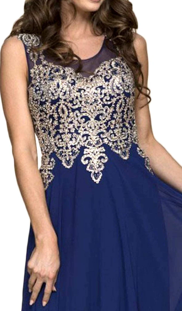 Get that royal look with this dress by Nox Anabel Y100. This long formal dress forms a sleeveless, illusion scoop neckline with fitted bodice embellished with gold appliques. The back has a zipper closure while the chiffon skirt runs towards the floor and flares an A-line silhouette. This Nox Anabel is perfect for any formal evening.