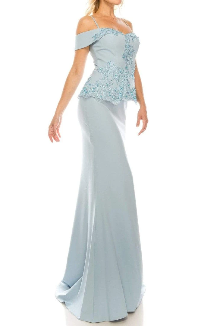 Uphold an attention-grabbing style in this Odrella 4617 creation. Exquisitely structed into a fitted bodice with accenting beaded lace appliques, this gown flaunts an off shoulder neckline with a sweetheart notch stringing from spaghetti straps. An exquisitely adorned peplum skirt splits at the back. The trumpet skirt glides along the hips and flares into a trail of train. Charm everyone with the sheer elegance of this Odrella masterpiece. Model is wearing the Blue color.