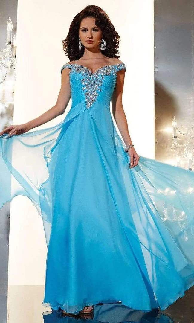 Make your grand entrance in this dress by Panoply 14636. This dress features a tasteful off the shoulder neckline along with adorning jeweled accents that cluster down the neckline towards the crisscross bodice in a regal motif. The fly-away style of the luxurious chiffon skirt cascades down your curves for an opulent and charming style that gives you the ideal hourglass figure. This dress also has a V-shaped back that ends with a zipper closure. Another great creation by Panoply.