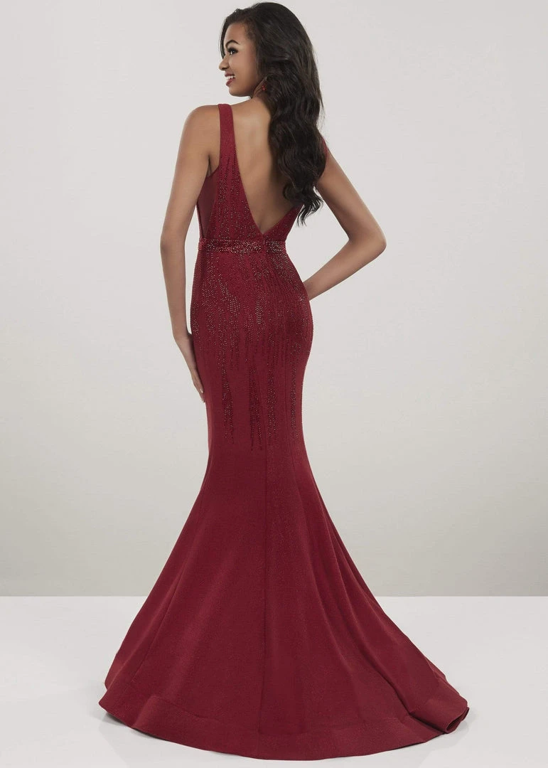 | Details: | Lame’ Jersey, Sleeveless, Sheer panels, Fitted bodice, Mermaid skirt, Low V-back, Sweep train, Rhinestones |