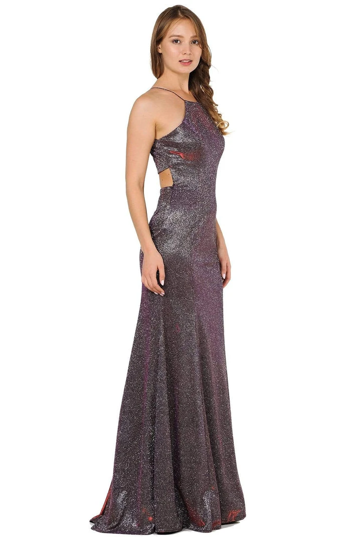 Flaunt your figure in this curve-hugging dress by Poly USA 8386. Tailored in glitter knit, this sleeveless piece mesmerizes in a halter neckline with spaghetti straps and fitted bodice. The back features a cropped racer cut style followed by a cutout at the lower back with center zipper closure. The skirt has a soft mermaid silhouette and brings drama with a subtle train finish. Make yourself into a vision of loveliness in this spectacular full-length dress by Poly USA.
