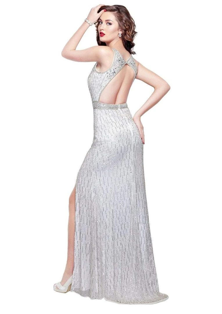 Get glamorous look with this dress by Primavera Couture 3016. This sleeveless dress features a halter neckline with a sexy back cutout. The entire bodice is adorned with beading and sequins. The skirt flows towards the floor in a sheath silhouette with a slit and sweep train. Get noticed in this radiant dress from Primavera Couture.