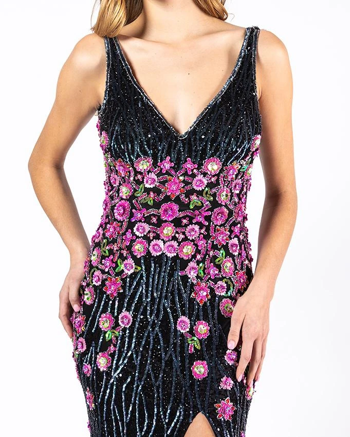 Enter the party and do that walk of a regal beauty in Primavera Couture 3238. Envisions in a sleeveless, plunging V-neckline with fitted bodice adorned with contrasting colored floral embellishments. The back flaunts a low V-cut and the skirt fashions a full length sheath skirt with a high slit and sweep train. Surround yourself with sparkle of glamour when you walk in this dazzling Primavera Couture dress.
