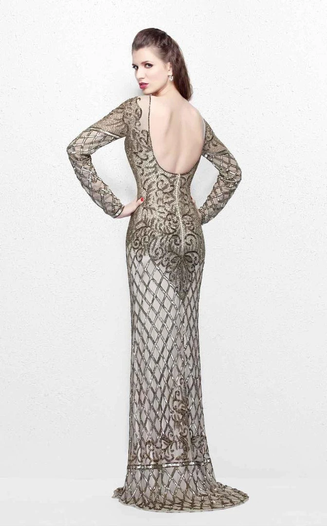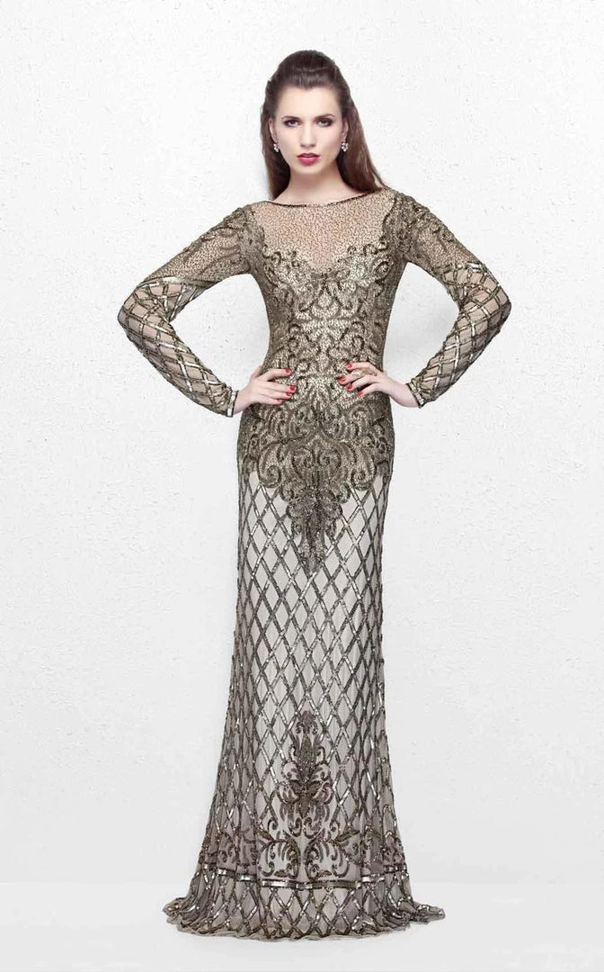 Achieve the next level of sophistication in this stunning Primavera Couture 1720 evening gown. This dress has a bateau neckline of sheer fabric with full length sleeves, low scoop back and a fitted silhouette intricately detailed wit ishimmering bead patterns. This full length gown has a subtle train at the back. This Primavera Couture will make you feel all royal and radiant looking! Model is wearing Champagne and Midnight colors