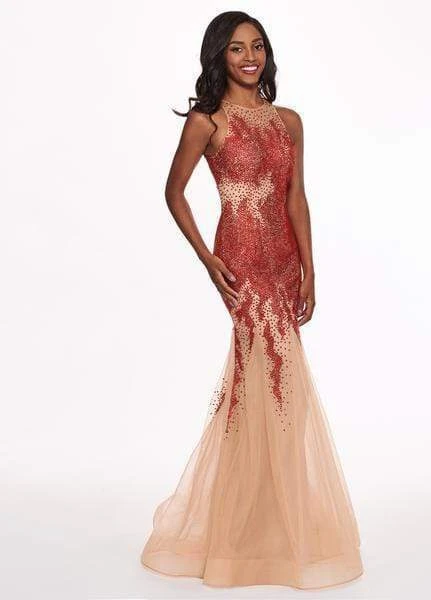 Stand out in every occasion with this daring creation by Rachel Allan 6452. This jersey tulle dress pleases in a sleeveless, halter neckline with entire dress ornate with bead embellishments. The fitted bodice gives way to a full length trumpet skirt with a horsehair hemline and sweep train finish. Look jaw dropping in this dramatic style by Rachel Allan.