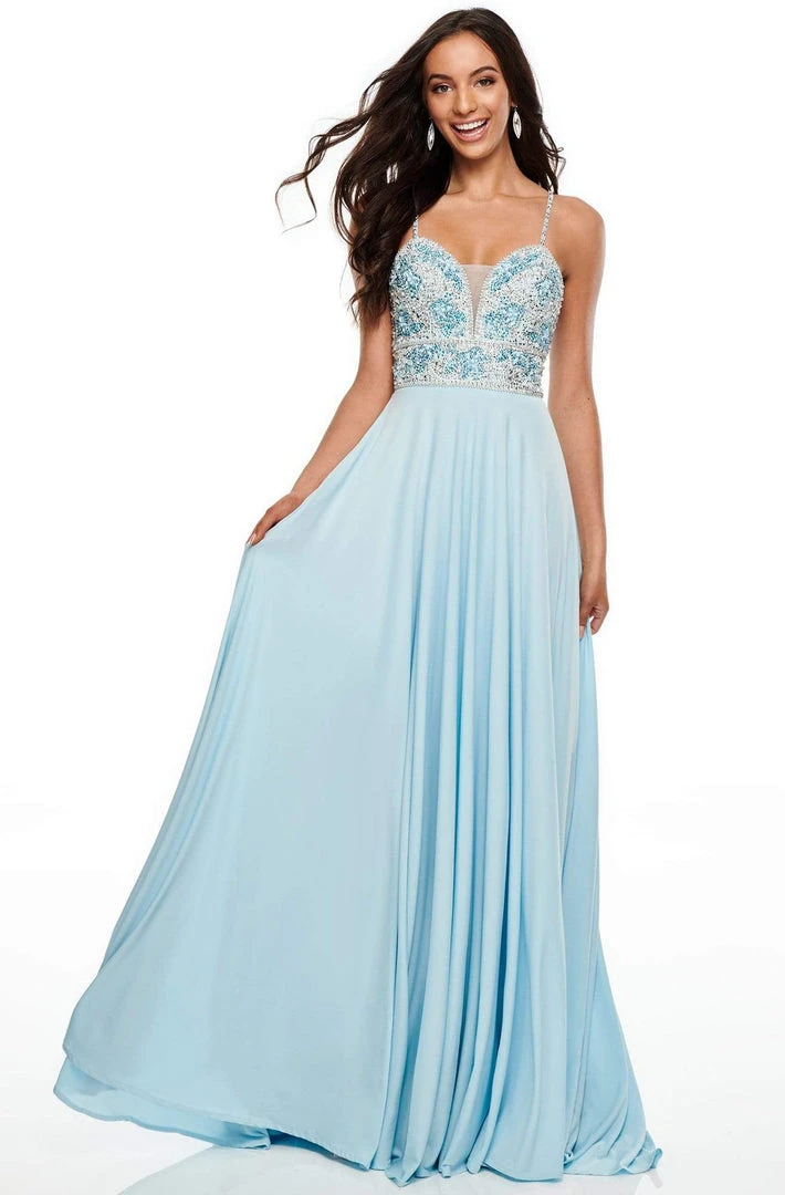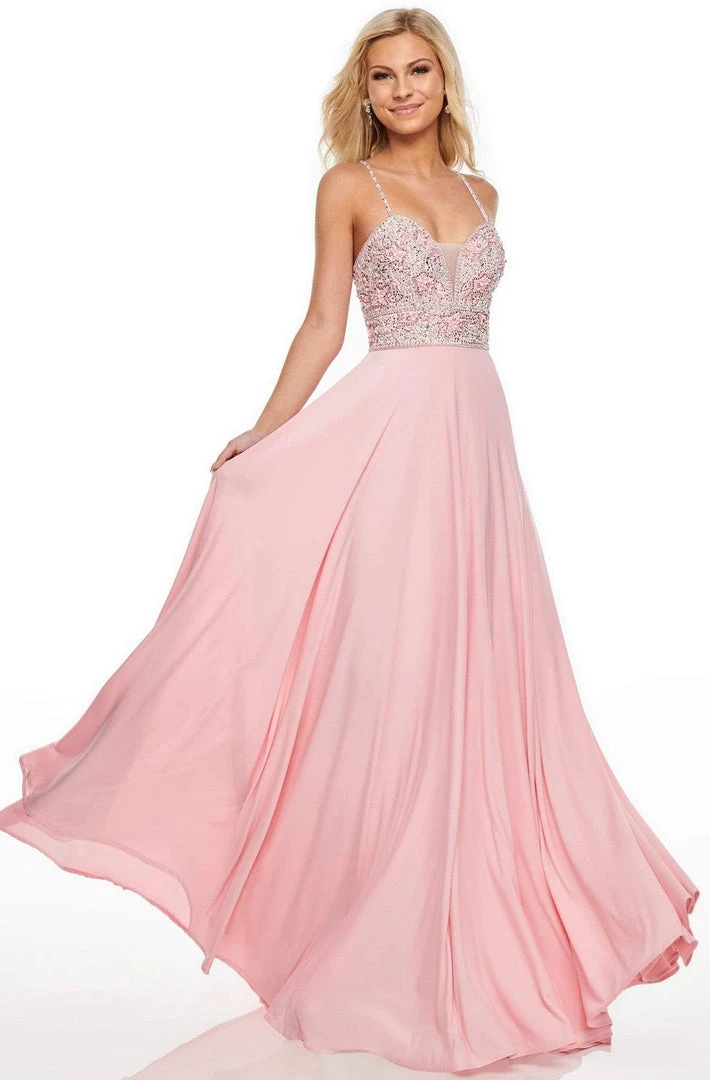 Take hold of the interest of the crowd in this mesmerizing Rachel Allan Prom 7157 creation. Crusted with an array of tonal beads and crystals, this gown flaunts a plunging sweetheart neckline with a tonal inset stringing from spaghetti straps. Nipped with an empire band and designed with a cutout back, the flowing chiffon skirt pools with a train. Conjure opulence that speaks of allure in this Rachel Allan masterpiece.