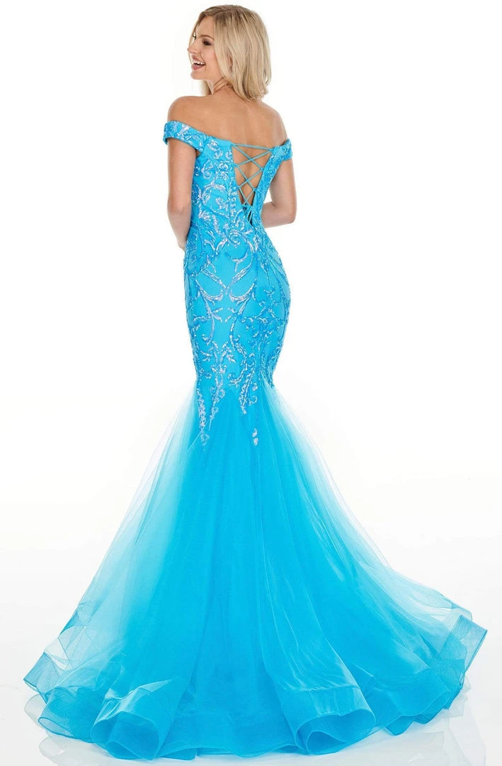 Mesmerize everyone in this charming dress by Rachel Allan Prom 7199. This stunner features a plunging off-shoulder neckline with sheer inset at mid-bust. The fitted bodice is adorned with sequins and beading. It has a lace up back while the tulle skirt forms a mermaid silhouette with a horsehair hemline. This Rachel Allan Prom dress is sure to make you the darling of the party!