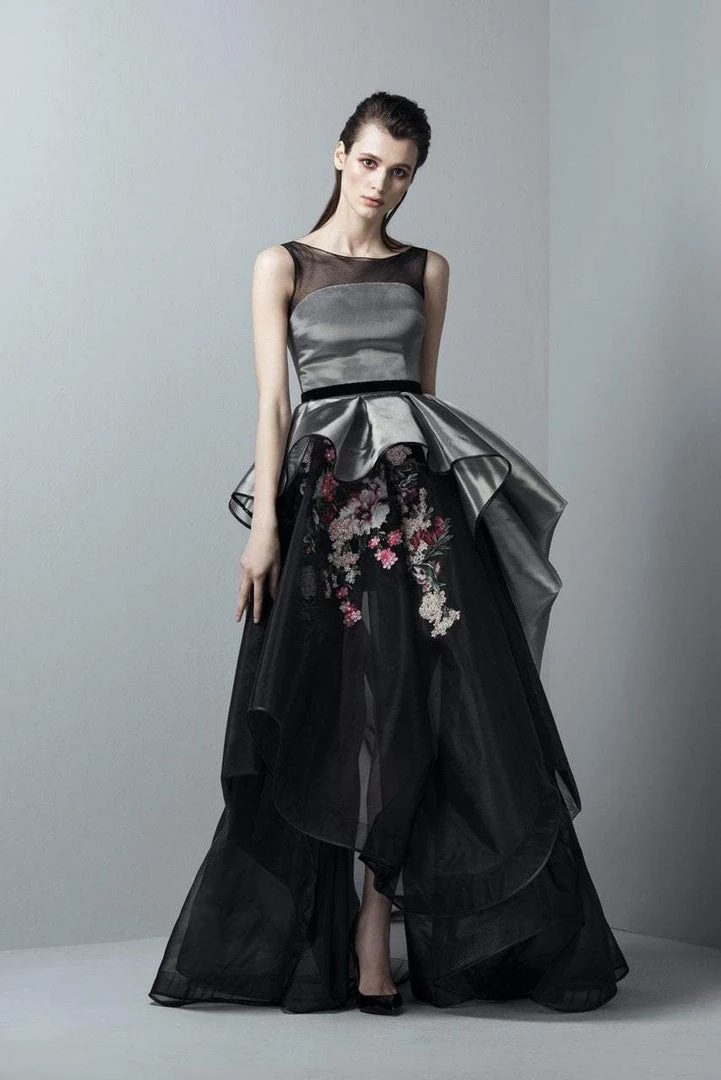 Exude that vibrant personality in this ravishing evening gown by Saiid Kobeisy RE3382. The sleeveless bodice showcases an illusion neckline. Ruffled asymmetric peplum adorns the waist to your hips. Vivid floral applique adorns the organza skirt with an A-line silhouette that flares to full-length-hem with a pencil cut mini skirt underneath. This Saiid Kobeisy creation is sure to make you steal the show.