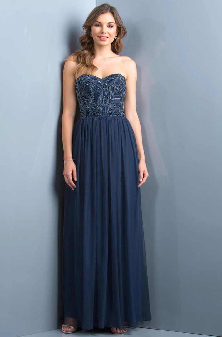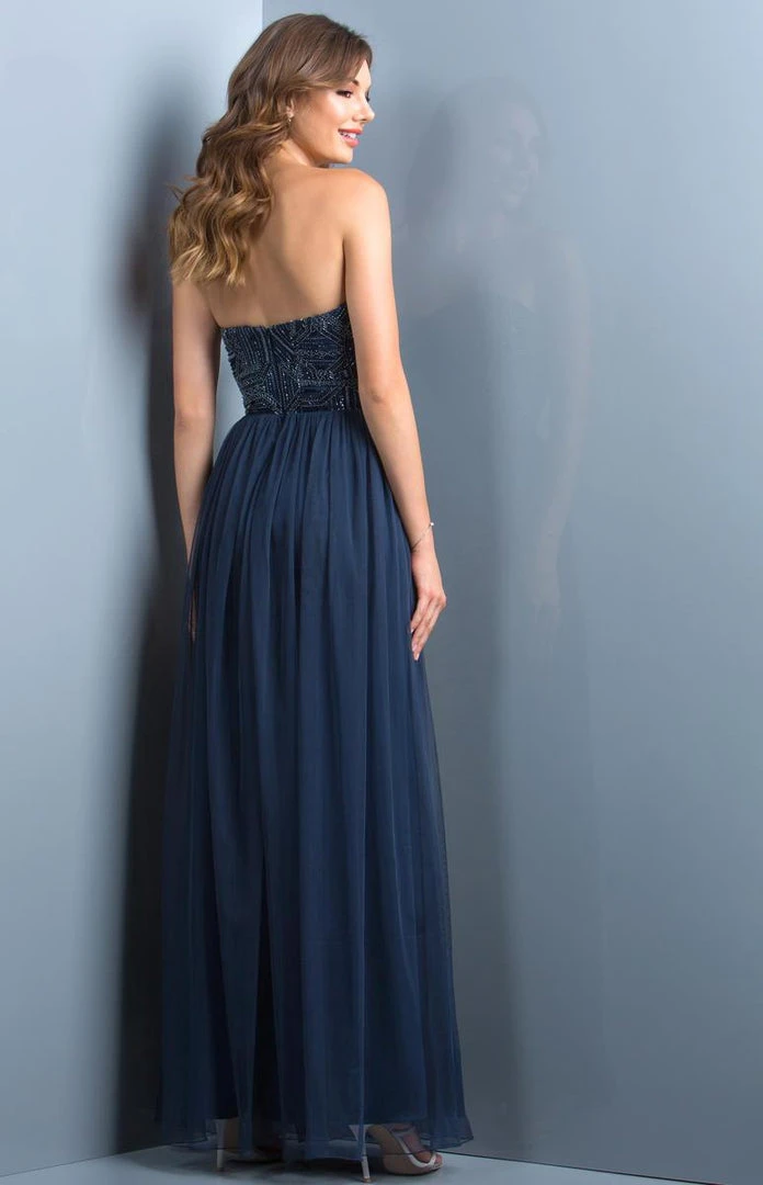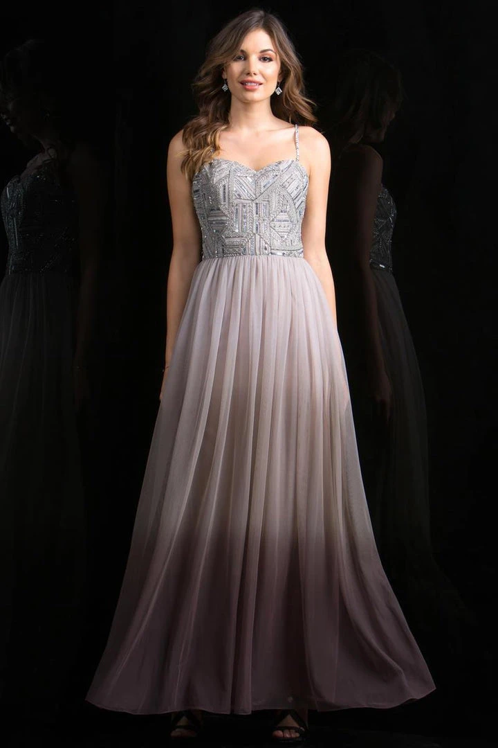 Dress in your absolute best as you claim his heart on this romantic night in this Scala 48801 creation. Beautifully detailed with an intricate geometric patterned spectacle on a fitted bodice, this stunner fascinates with a sweetheart neckline with an optional removable spaghetti straps. The chiffon skirt cascades in shirred pleats down to hover the floor with a full-length hemline. Cherish an opulent night that is blooming with romance in this Scala masterpiece.