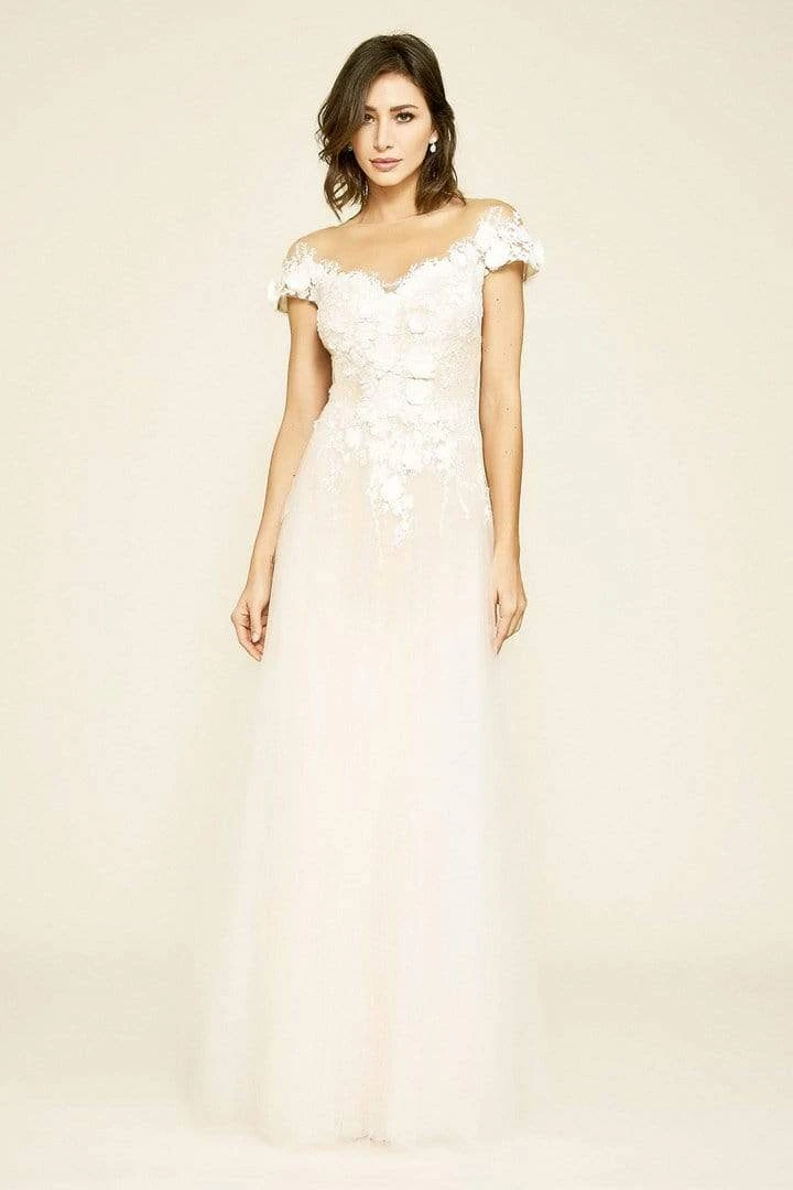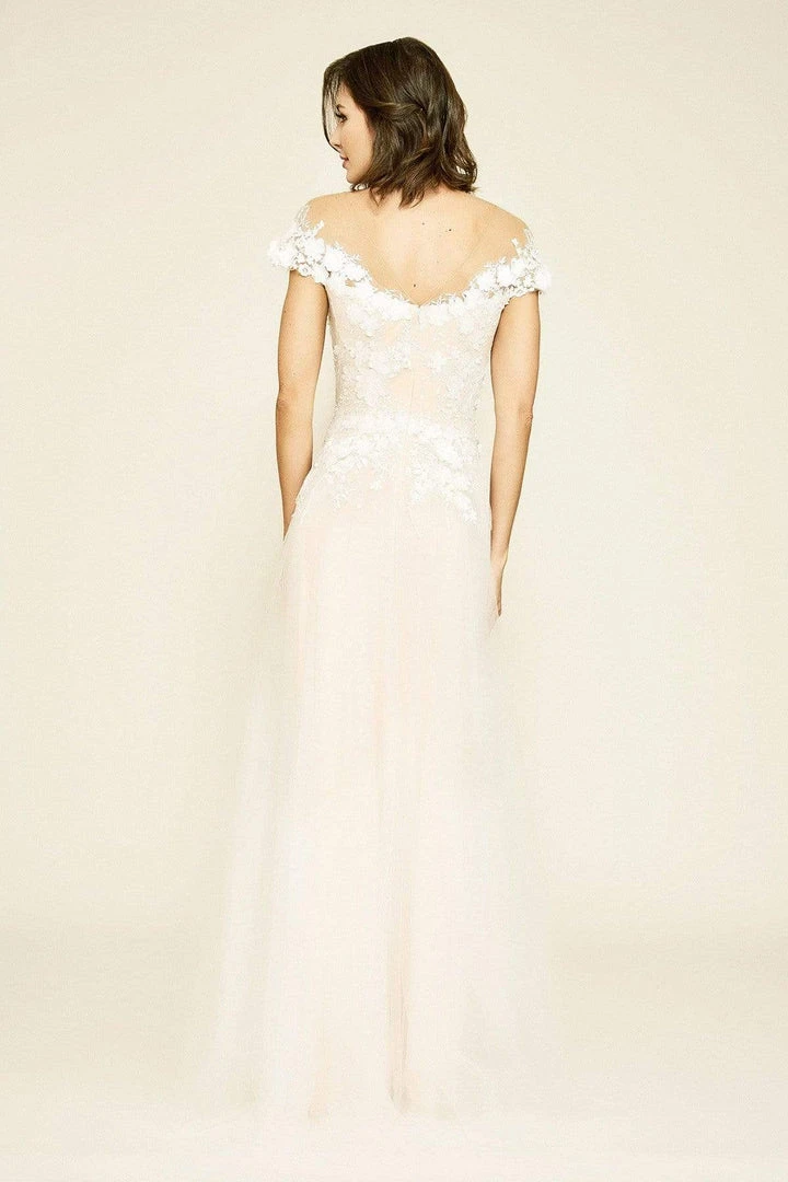 This tulle bridal gown is nothing less than regal. Its cinched waist, off-the-shoulder illusion, and bodice dusted with dimensional flowers will make you feel like a royal.