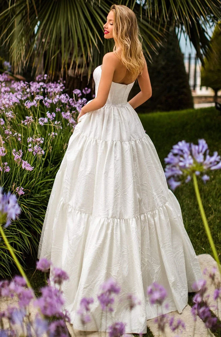 | Details: | Jacquard, Floral motif, Strapless, Fitted bodice, Shirred skirt, Back zipper closure |