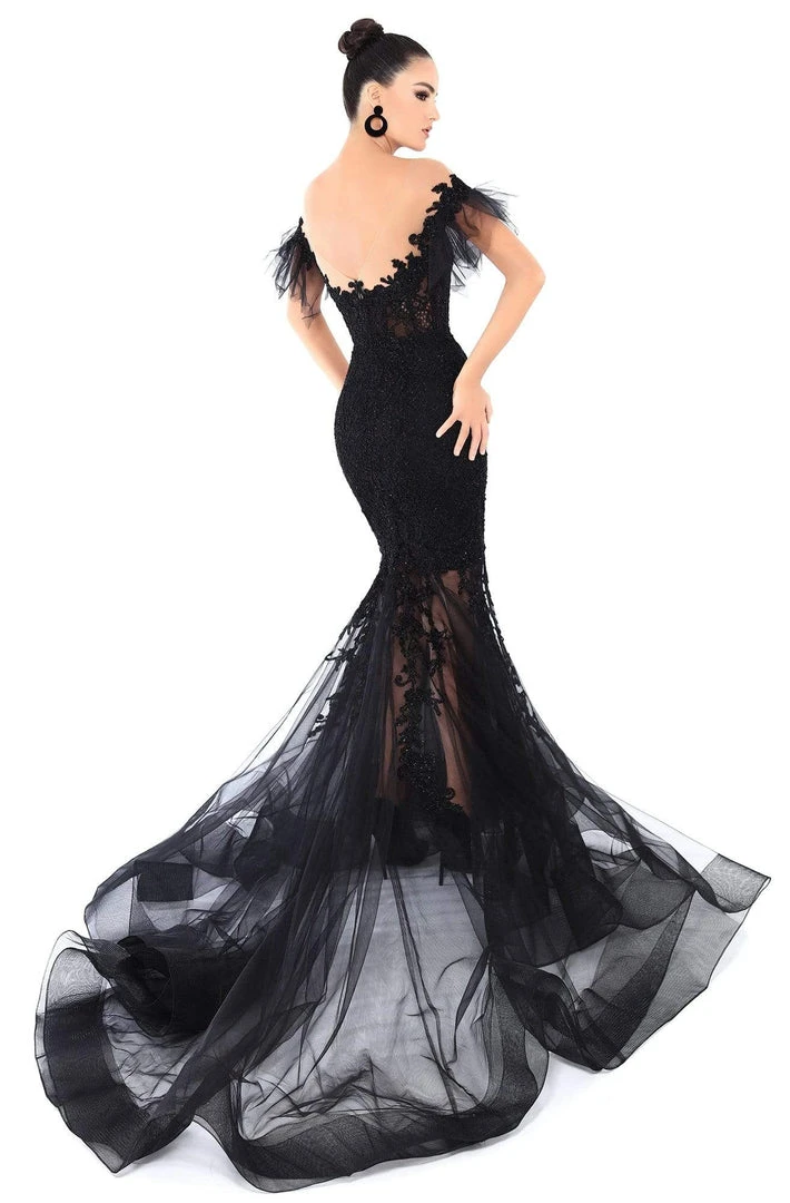 Mesmerize everyones this dramatic dress by Tarik Ediz 93645. Fashions an illusion neckline with rule sleeves. The fitted bodice has a low V-back, a zipper closure, and is lavishly adorned with beading and appliques. The skirt fits at the thighs and flares at the bottom to a mermaid silhouette completing the look in a sweep train finish and horsehair hemline. Showcase your amazing figure with this curve-hugging Tarik Ediz dress. Find more prom dresses!