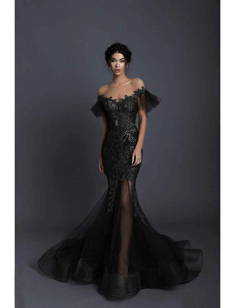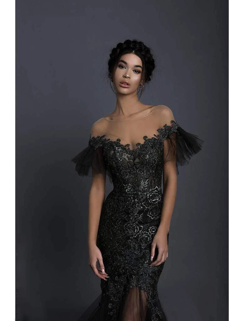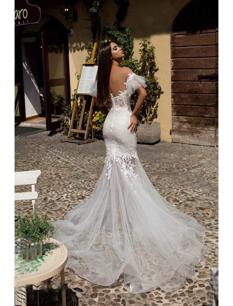 | Details: | Sheer fabric, Tulle sleeves, Fitted bodice, Beading, Appliques, Mermaid skirt, V-back, Back zipper, Horsehair hemline |
