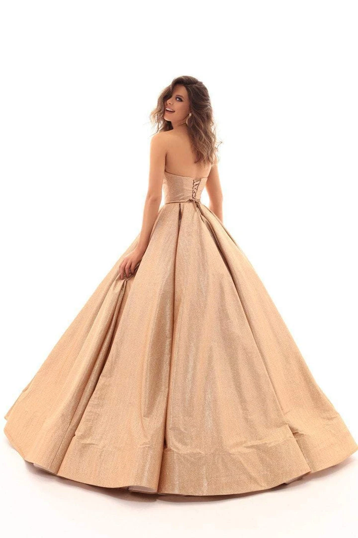 Channel your inner princess when you wear this gown by Tarik Ediz 93711. Features a strapless, V-neckline with fitted bodice and a lace up back. This glittering gown flourishes a pleated ballgown skirt. Make your night one to remember in this design by Tarik Ediz.