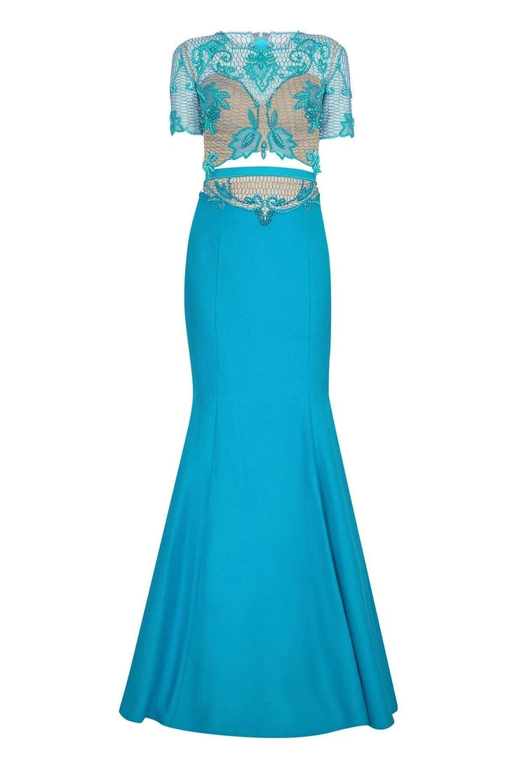Heighten your curves in this amazing evening dress from Tarik Ediz 50108. The dress features an illusion bodice with elegant short sleeves and is covered in sparkling beaded details to the cropped waist. Sophisticated net adds style as this two-piece ensemble glides to the full-length mermaid silhouette hem, complete with a romantic and enchanting long train. Get ready for everyones stop and stare when you show up in this Tarik Ediz dress. Model is wearing Navy color.
