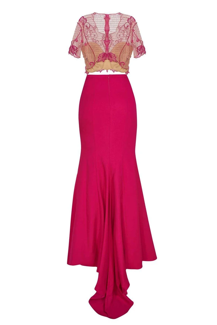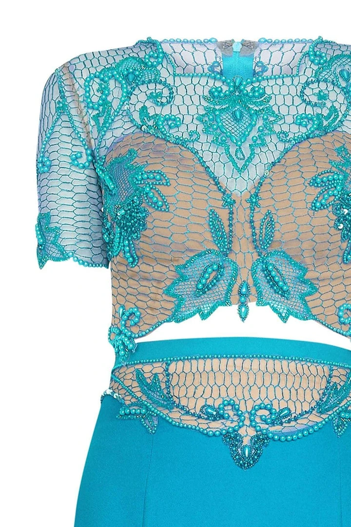 | Details: | Two piece dress, Sheer fabric, Short sleeves, Beaded crop top, Mermaid skirt, Beaded waistband, Sweep train |