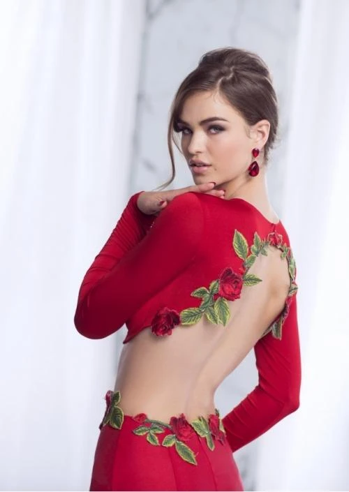 | Details: | Long sleeves, Two-piece, Rose embellishments, Open back |