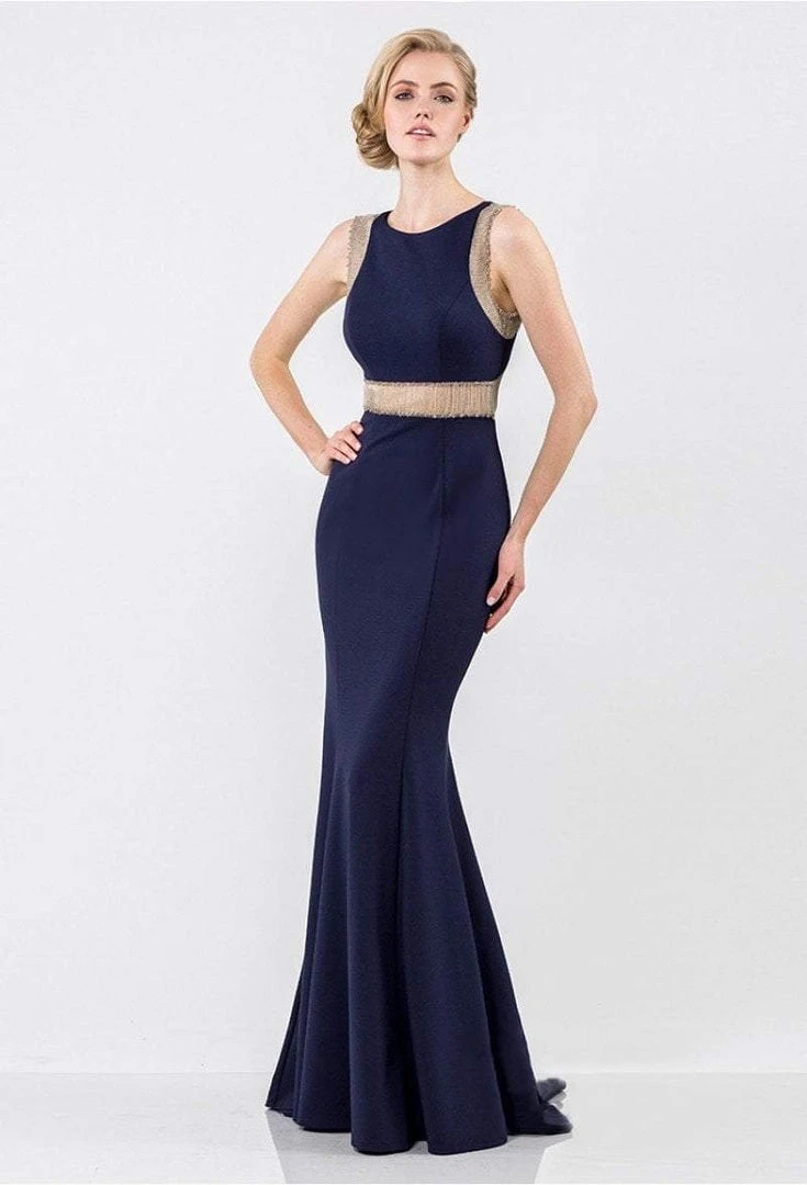 Bring on that commanding beauty in this dress by Terani 1525E0928. Showcases a sleeveless and jewel neckline made of scuba fabric. The bodice is adorned with embellishments on the side and midriff. The slim silhouette glides smoothly down the floor with the sweeping train that finishes in a glamourous look. This stunning long Terani dress brings together all the essentials for a great look at any party! Model is wearing Navy color.