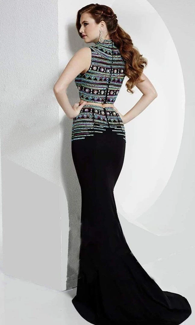 | Details: | Two piece, Cropped top, stand up collar, Geometric multi-colored beadings, Bare midriff, Sweep train |