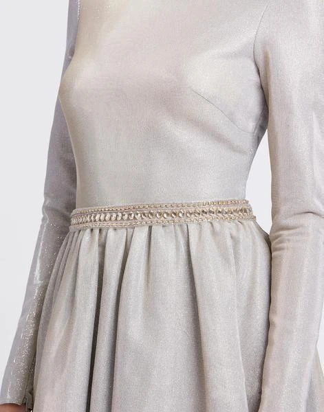 | Details: | Fitted, Long Sleeves, Beaded Belt, Pleated Skirt, Side Slit, Floor Length, Full Back, Back Zipper Closure, Sweep Train |