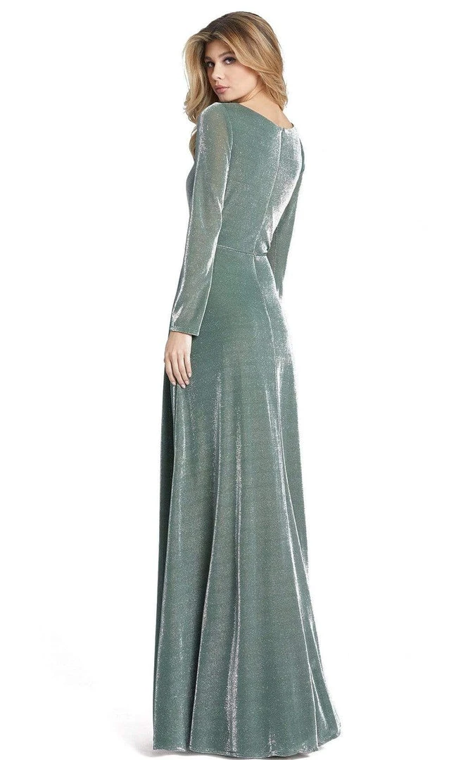 Glow with prominent elegance in this Ieena Duggal 49088 creation Adorned with pleats wrapping the bodice, this dress has a v-neckline with long sleeves. Opening with a sultry slit, the A-line skirt cascades to reveal a floor length finish. Look charming from all angles in this Mac Duggal masterpiece.