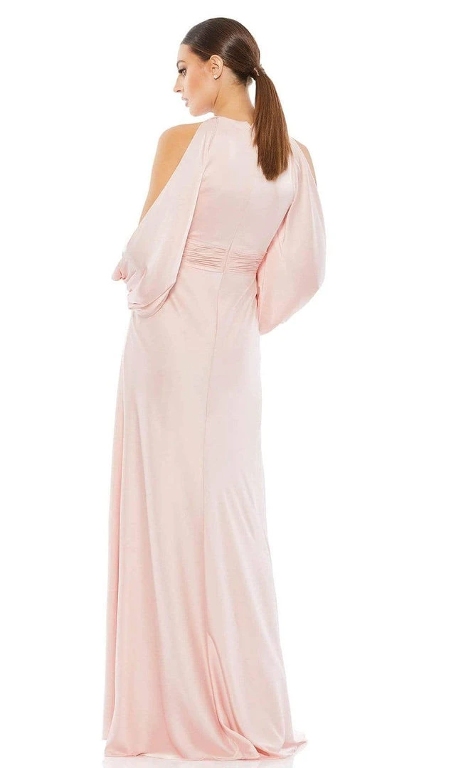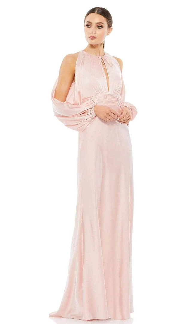Grace that spectacular event like a goddess in this Ieena Duggal 55397 creation. Accented with a tie string creating a jewel neckline, this beauty shows a gathered keyhole cutout on the bodice. Cold shoulder accents style the long blouson sleeves. The skirt flows into a perfect trumpet silhouette with a brush of train. Saunter on the red carpet and shine in this Mac Duggal masterpiece.