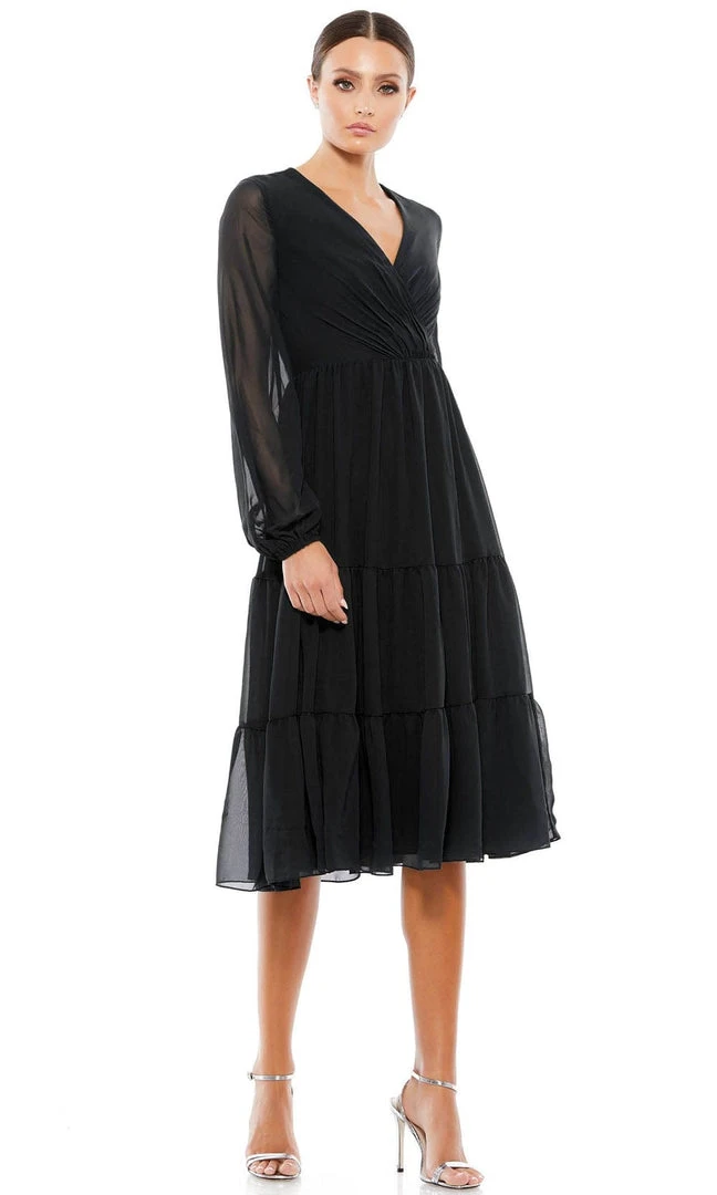 Look regal as you make such a lasting impression in this Ieena Duggal 55637 creation. Exquisitely tailored into a fitted silhouette with ethereal chiffon, this dress presents a surplice bodice with a v-neckline and a full back. Long sheer sleeves frame this stunner as the panel-styled skirt flows into a knee length hemline. Be the definition of feminine flair in this Ieena Duggal masterpiece. Exquisite attention to detail is the hallmark of Mac Duggal dresses. Mac Duggal dresses encapsulate the very essence of the women who wear them, reflecting their confidence, feminine power, and inner beauty.