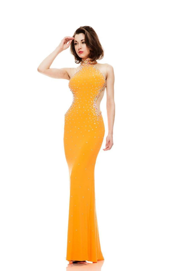 Have your onlookers get captivated with your daring style and iridescence in this sultry Johnathan Kayne 6009 creation. Seamlessly tailored with a stretch jersey fabric to accentuate those lush contours, this darling has a high halter neckline with a bejeweled choker accent and cutaway shoulders. Flaunting nude illusion side panels outlined with shimmering faceted crystals, the shapely back has a faux racerback treatment and an invisible zipper for closure. Majestic highlighted with flickering ornaments, the sleek skirt waterfalls softly to a full length in a lush fabric. Be the light that illuminate the hearts of the public in this stunning Johnathan Kayne masterpiece.
