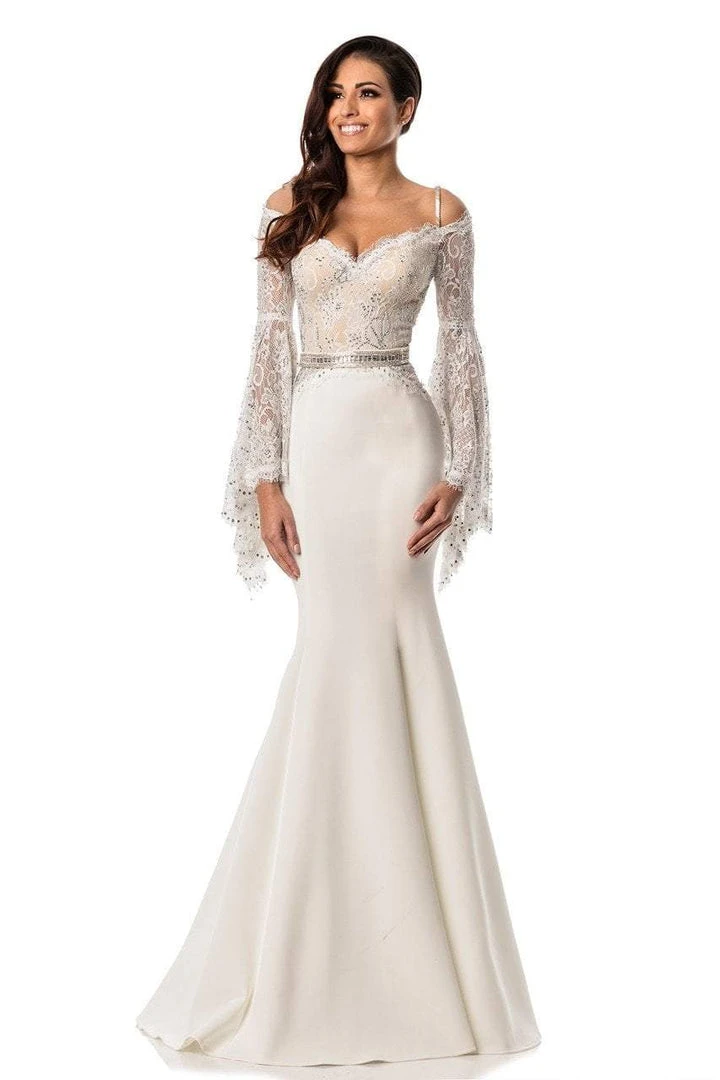 Walk into a room and be that unforgettable ethereal vision the crowd has been waiting for in this beautiful Johnathan Kayne 7244 creation. Fantastically enveloped in a delicate lace fabric over a nude lining, slender straps lead to the off-shoulder neckline accented with scalloped edged sweetheart shape. Lace bell sleeves with scattered jewels flow in soft ripples down to the fingertips. Crowned with a sparkling band defines the natural waist, delicate lace shrouds the hips as an illusion mid-open style graces the back. The contoured skirt forms a fluted and flared mermaid denouement. Celebrate this magical night as you inspire awe in this enchanting Johnathan Kayne masterpiece.