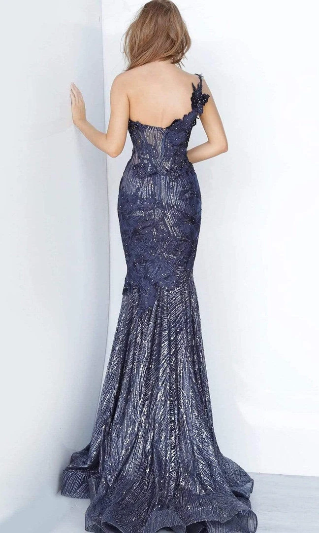 You are sure to be the life of the party when you are wearing this dazzling Jovani 02445. Tailored with a sing shoulder straps, this stunner graces with a sweetheart neckline, adorned with lace appliques and stone accents, corset bodice, open back, and a zipper closure. The trumpet silhouette skirt features horsehair hemline and a sweep train. Get noticed in this radiant creation from Jovani.