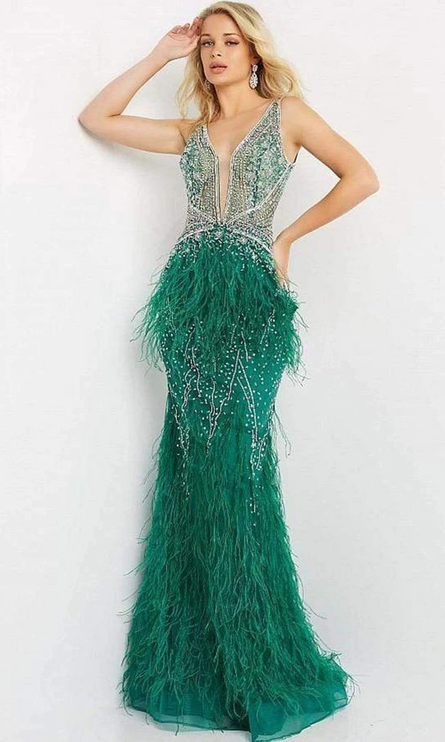 Capture the glamour as you walk on this gorgeous evening gown by Jovani 03023. The sleeveless sheer bodice s is fully adorned with luxurious beadings while showcasing an illusion plunging neckline and a low scoop open back. The lavish feather accent the skirt as it cascades to a floor-length forming a beautiful fitted silhouette. You are certain to turn heads in this attention-grabber Jovani creation.ÂÂ
