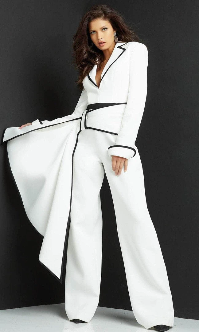 Capture the glamour as you walk on this stunning gorgeous Jovani 06917 masterpiece. Divinely tailored with contrasting trim on scuba silhouette, this elegant piece showcases a notched collar plunging V-neckline, fully closed back and long sleeves with fold-over cuffs detail. Highlighted with a wide belt that flows from one side, this ensemble is completed with a high waist wide straight-leg pants that cascades down to a full-length hem. Breeze through your special day while making a stylish statement in this Jovani creation. Model is wearing the White/Black color.