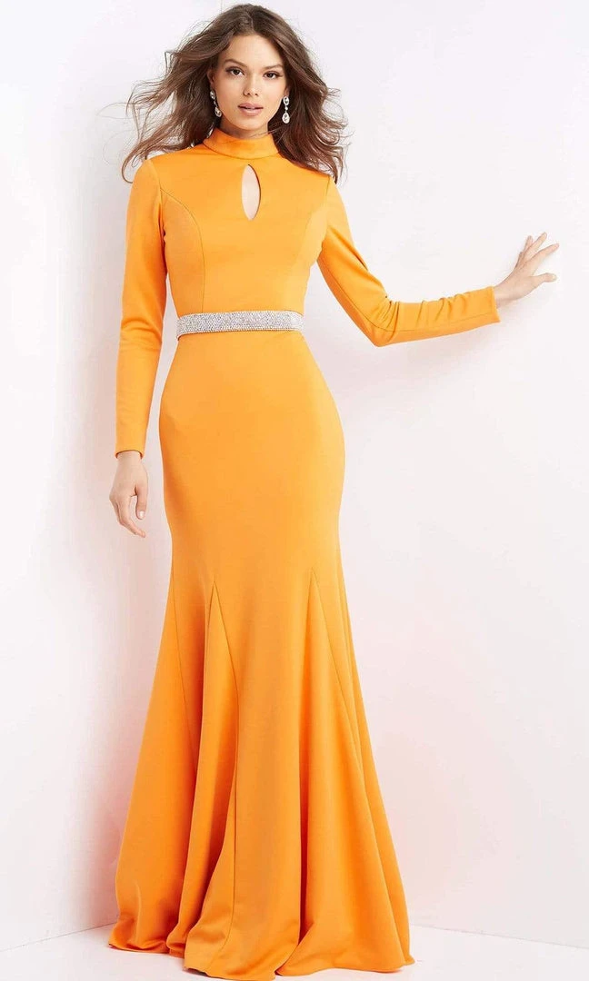 Exude the charm of the finest celebrities in this Jovani 07392 creation. Flatteringly styled with long sleeves and a cutout bodice, this piece shows a high neckline. Styled with an open back and an embellished waist, the trumpet skirt ends into a sweeping train. Be destined to turn heads in this Jovani masterpiece. Models are wearing the Orange and Royal colors.