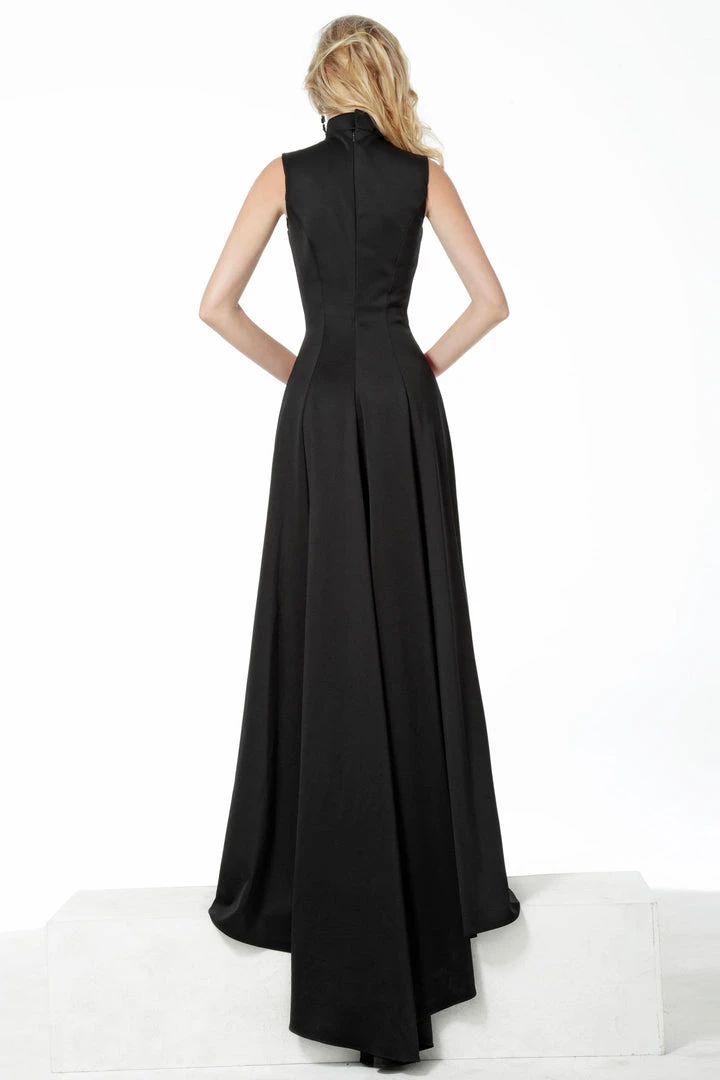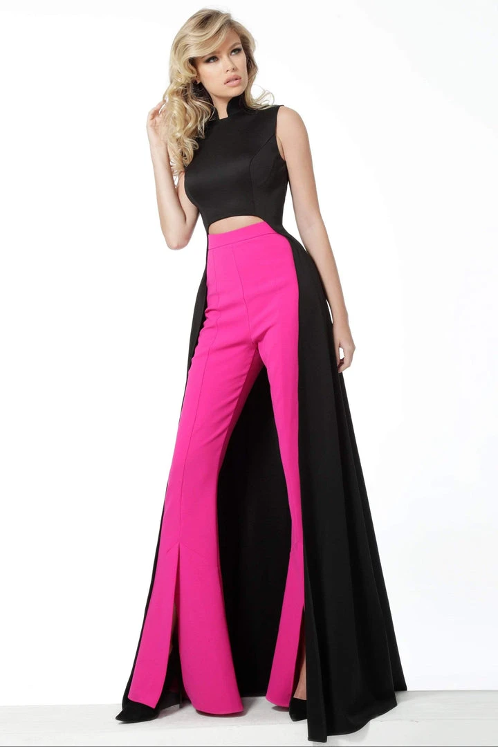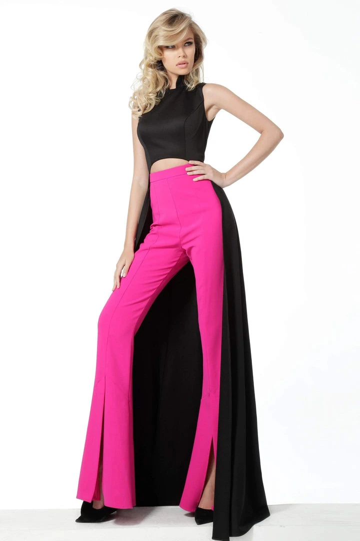 Capture all the attention as you start a new trend wearing this two-piece set jumpsuit from Jovani 3377. This two-toned ensemble is sophisticated tailored in stretch knit fabric, showcases a sleeveless fitted crop top with stand-up collar and features an extended back style creating an overskirt with sweep train finish. This formal outfit fashions a curved bare midriff leading to the long slender, high waist pants with slit flared bottom. This chic Jovani style will definitely create a striking presence on the red carpet and black tie event. Model is wearing Black/Fuchsia color