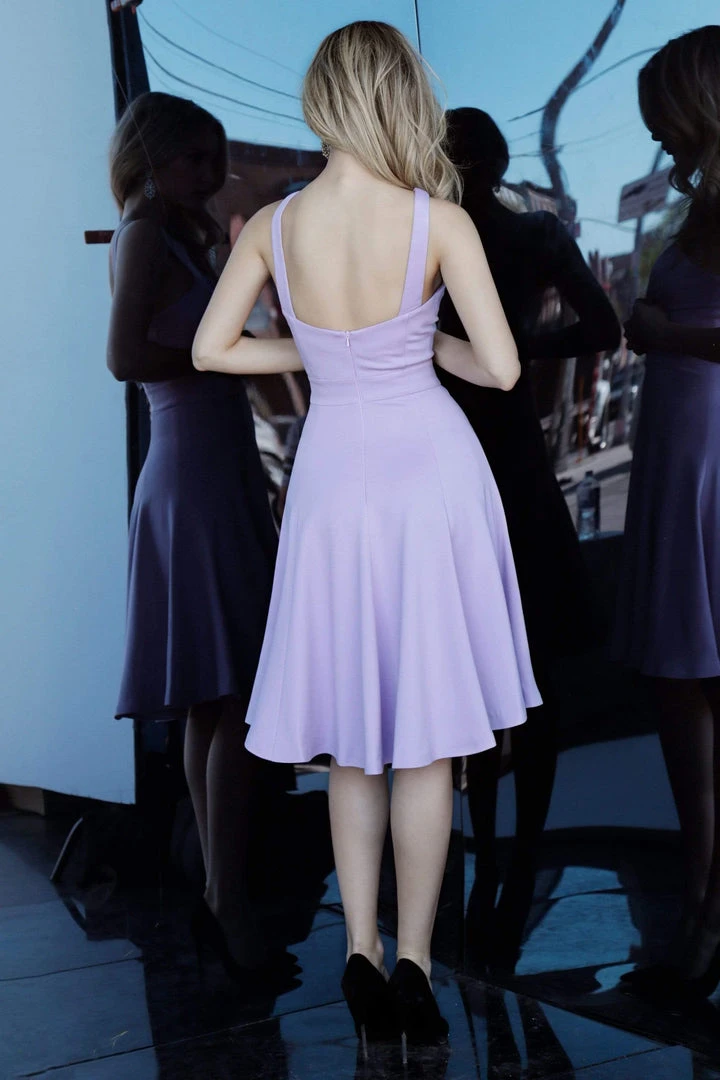 Look fresh and pretty in this dress by Jovani 48996. This dress has a sleeveless, modified cut-in shoulders with jewel neckline and a seam formed fitted bodice and tapered natural waist. The back of the dress shows off a square shape style with tapered straps and concealed zipper closure at the center. Finishing the look is a knee length A-line skirt. This Jovani dress is a timeless look suited from casual to formal party. Model is wearing Lilac color.