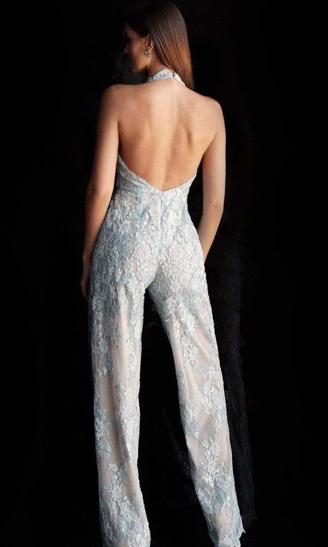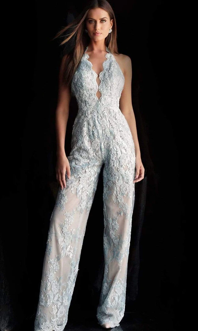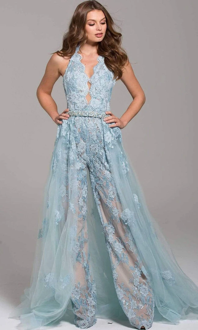 Enter the party and do that walk of a regal beauty in Jovani 60124. Brandishes in a sleeveless, halter V-neckline with scalloped lining. The fitted bodice is ornate with lace appliques and cinched in an embellished belt. Designed with long straight leg pants, this jumpsuit is complemented with a sheer overskirt for added drama. You are a breath of fresh air in this dreamy Jovani look. Model is wearing Light-Blue color. Find more prom dresses!