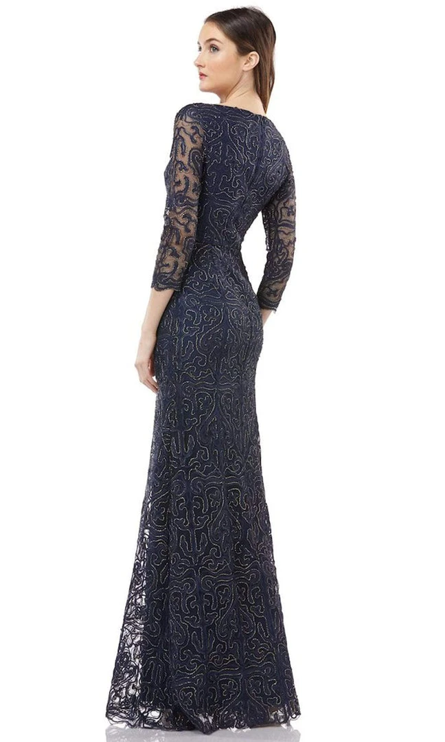 Promote attention-grabbing style in this stunning JS Collections 866711 creation. Embroidered in soutache pattern, this gown features a bateau neckline with illusion long sleeves. This delicately detailed lace evening gown is a classic piece with figure-flattering details. Flatter your figure with this eccentric design by JS Collections.