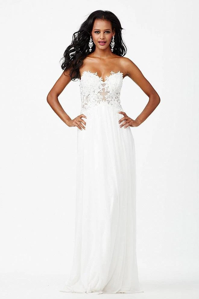 Take his breath away in this divine prom dress by Jovani JVN30805. Whether it is your wedding day or your prom day, you will want to leave your special date in awe of your grace and beauty. This full-length strapless stretch mesh gown features a sweetheart neckline and sheer bodice adorned with intricate textured floral lace. The flattering fit and flare silhouette with the flowing skirt from the natural waistline is perfect for all body shapes. This Jovani design dress is sure to capture the eyes and heart of your loved one. Model is wearing the White color.