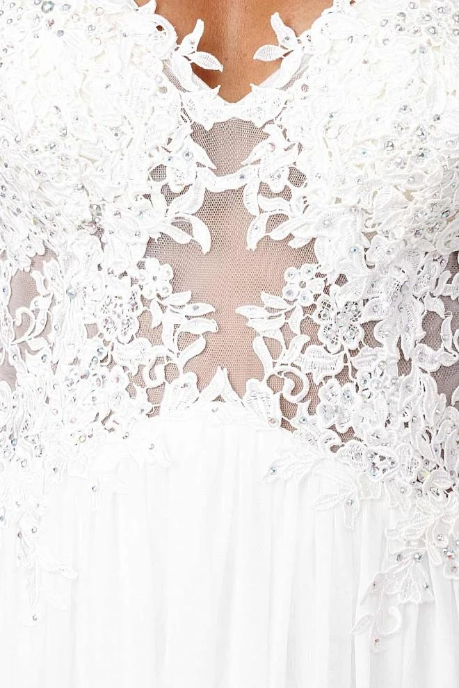 | Details: | Strapless, Sheer and lace top, Chiffon, Side zipper, Floor length hem |