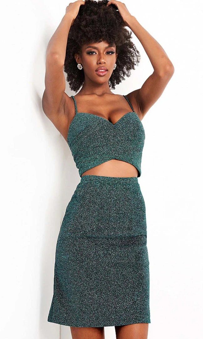 Be a vamp in an alluring ensemble from Jovani JVN04562. This two piece dress features a sleeveless, plunging V neckline with shoulder straps. The crop top has a lace up back. The skirt forms a fitted silhouette. You are statuesque in a posed dress from Jovani. Model is wearing Emerald color.