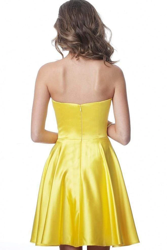Bring on that commanding beauty with this cocktail dress from Jovani JVN1717. Features a strapless, straight across neckline with fitted bodice styled with a back zipper closure. The skirt flourishes a flowy A-line skirt and finishes at mid-thigh hem. This Jovani dress is a charming choice for your next special occasion. Model is wearing Yellow color.