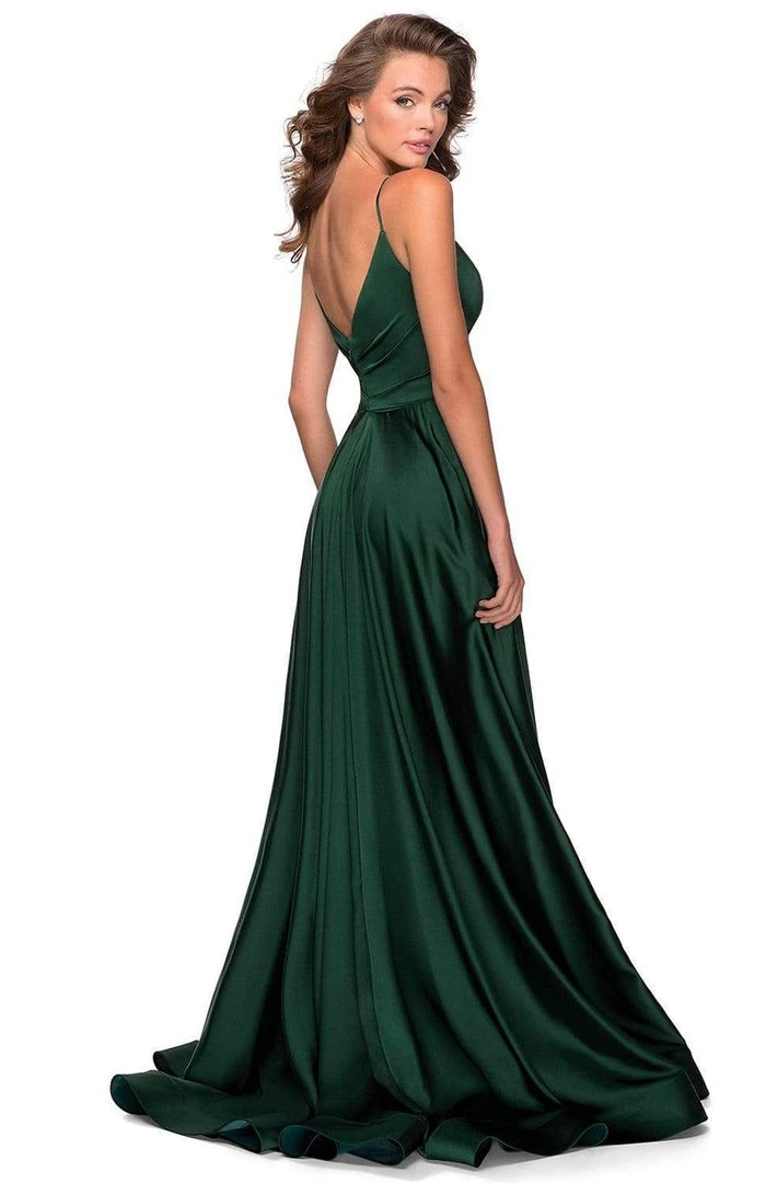 | Details: | Satin, Sleeveless, Faux wrap bodice, Pleats, Slender straps, Thigh-high leg slit, V-shaped back, Back zipper closure, Horsehair hem |
