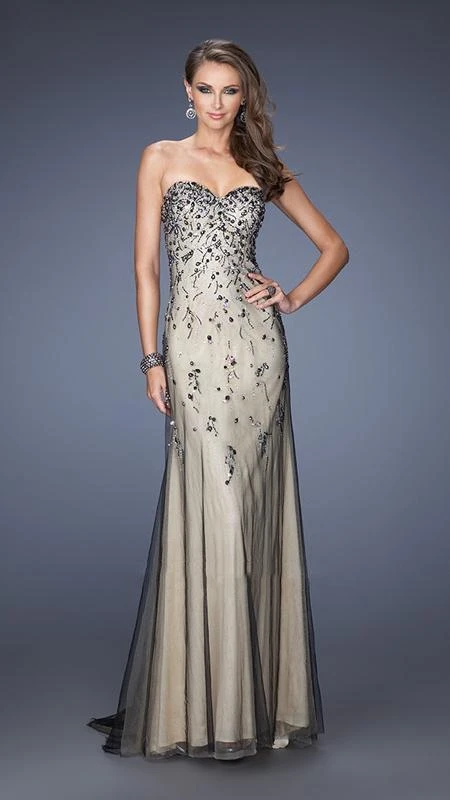 Make an extraordinary statement when you walk in this classy evening dress from La Femme Gigi 20080. The dramatic design is centered with a strapless sweetheart neckline. Blossoming accents scatter across the bodice and down your hips. A two-toned effect creates a full length layered skirt. Animated fabric and a sweep train complete this style. Turn yourself into a timeless beautiful goddess in this creation by La Femme Gigi.