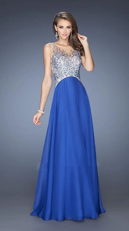 Sparkle in beauty wearing this prom dress by La Femme Gigi 20163. The scoop neckline and sleeveless cut are delicately made with illusion fabric. Astonishing sequins are wild atop the bodice in a sweetheart design to an arched waist. The solid skirt is pleated in an A-line design. A full length effect makes this gown dramatic and beautiful. It’s a stunning look for any special event.