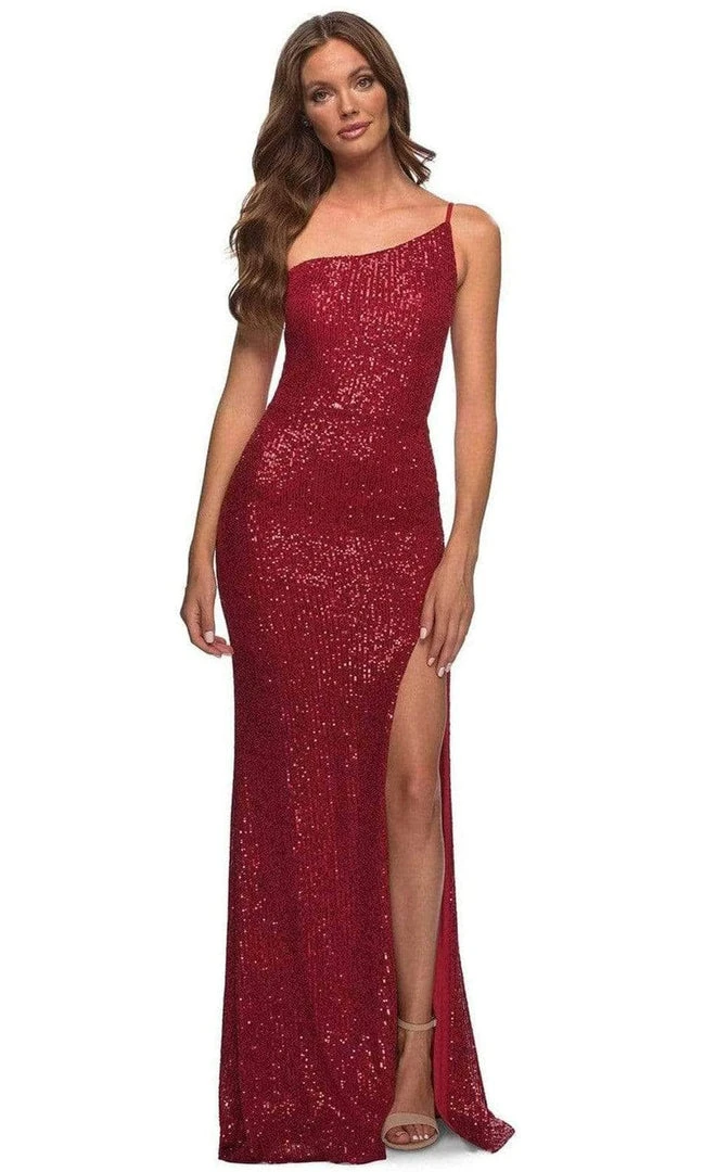 Adorned with glimmering sequins, this one shoulder gown flatters with a fitted bodice and an open back. Reveling a slit, the skirt spills into a sheath silhouette. Model is wearing Red color.