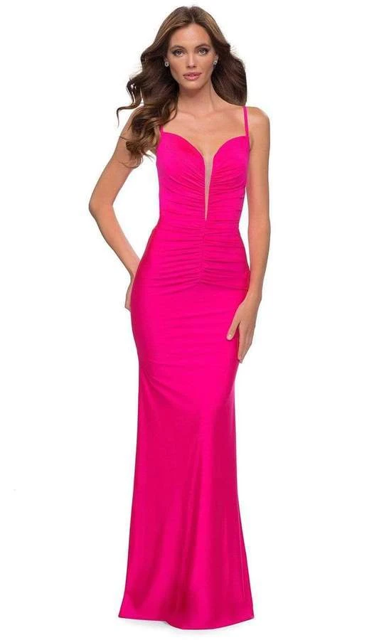 | Details: | Sleeveless, Spaghetti straps, Sheer panel, Ruched, Fitted bodice, Plain, Strappy, Open Back, Back zipper, Floor length, Sweep train |