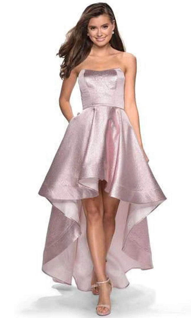 Made of metallic fabric, this strapless dress has a sweetheart neckline with fitted bodice styled with a back zipper closure. The high low skirt flares an A-line silhouette and is accented with pockets and sweep train finish.