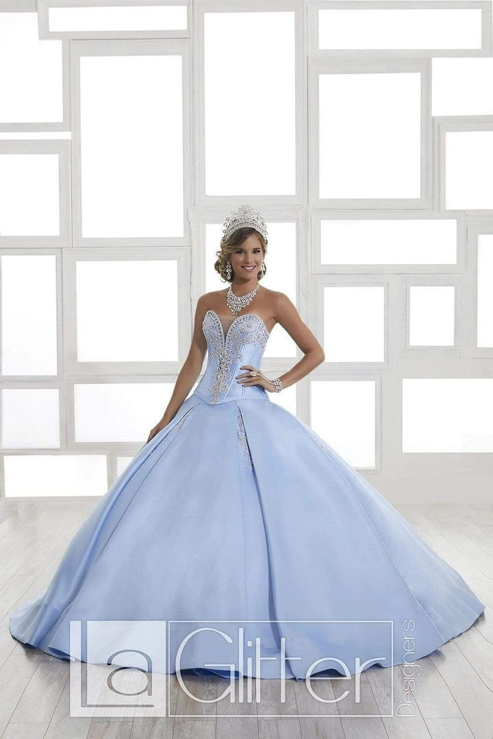 Be glorified as the belle of the ball in this fascinating LA Glitter 24029 creation. Brilliantly ornamented with an intricate jeweled spectacle, this corset bustier reveals a plunging sweetheart neckline with an illusion inset. A lace up detail sculpts the bodice. Intricate beaded appliques glamourizes the folds as pleats of Mikado rushes to the floor with a ribbon appliqued train. Lavish in the sheer romance of this fascinating LA Glitter masterpiece.