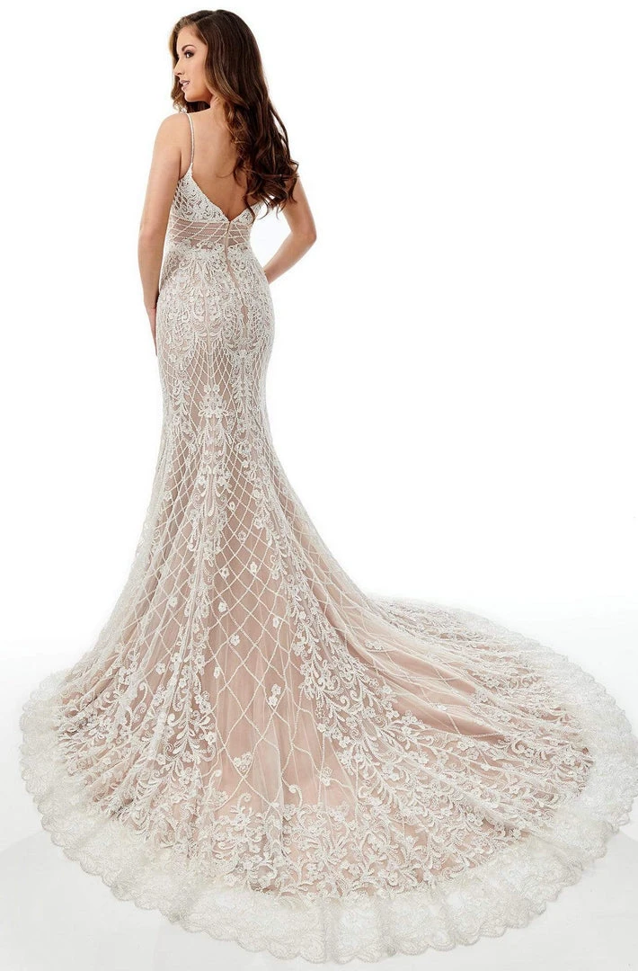 Exude timeless and effortless elegance in a luxurious wedding gown from Lo’Adoro Bridal By Rachel Allan M748. Crafted with lavish patterns of caviar beads and embroidery details on tulle overlay, this romantic piece charms with a plunging sweetheart neckline and back held by matching beaded straps. The entire gown features a precise mitered embroidery pattern and a full flared skirt. The gown finishes with covered button closure and a chapel length train. You are certain to capture the hearts and attention of everyone at your wedding when you walk down the aisle in the glamorous Lo’Adoro Bridal By Rachel Allan. Model is wearing Ivory Nude.