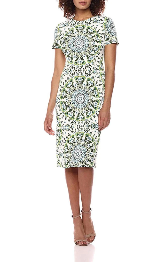 Inspire a chic, artful style in this midi-sheath dress by London Times T2918M. This floral multi-print jersey dress is styled with jewel neckline, short sleeves and a fully enclosed back with hidden center zipper. Radiate style and elegance in this London Times creation.